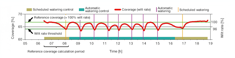 For these reasons, Kubota developed an algorithm capable of adapting to major changes in plant posture. When a sudden drop in coverage rate is detected and the rate remains low for a certain period, the system determines that the change is a result of caretaking activities and adjusts its settings accordingly to prevent malfunction.