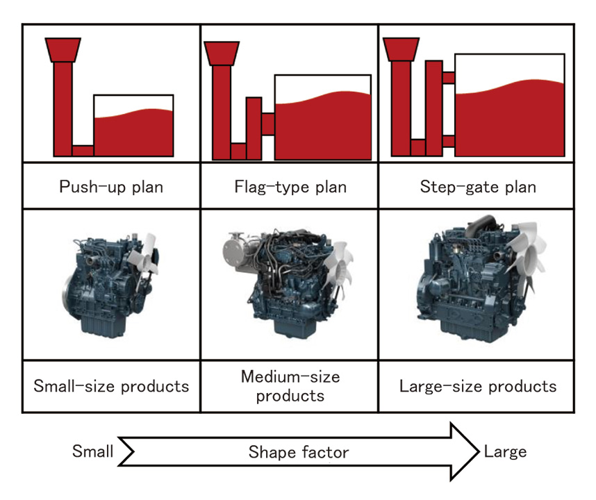 Engine castings are becoming larger, more complex in shape, and thinner-walled in recent years. On the other hand, as the shape factor (volume/minimum wall thickness) of engine castings increases, it becomes more difficult for molten metal to fill the mold quickly, so the gating system plans for castings have changed from the push-up plan to the flag-type plan and step-gate plan. Therefore, in this study, in order to establish design guidelines for the step-gate plan, we first clarified the effects of the sprue ratio and pouring velocity on the molten-metal filling behavior using methods such as flow simulation and water models, and then determined the appropriate sprue ratio range by verifying it through direct observation experiments.