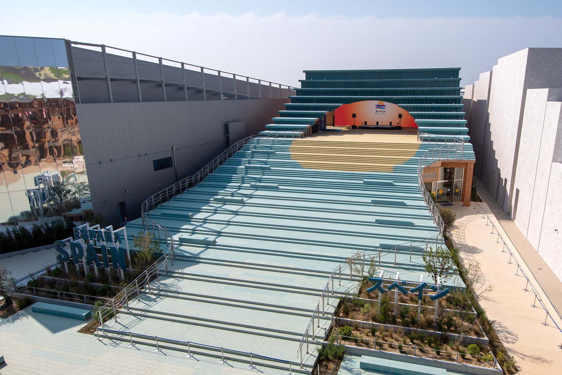 The impressive architectural design of the Spain pavilion symbolizes the “ocean” and the “sun.” Visitors first enter through the Plaza del Sol to be greeted by video works by contemporary artists projected on a giant screen.