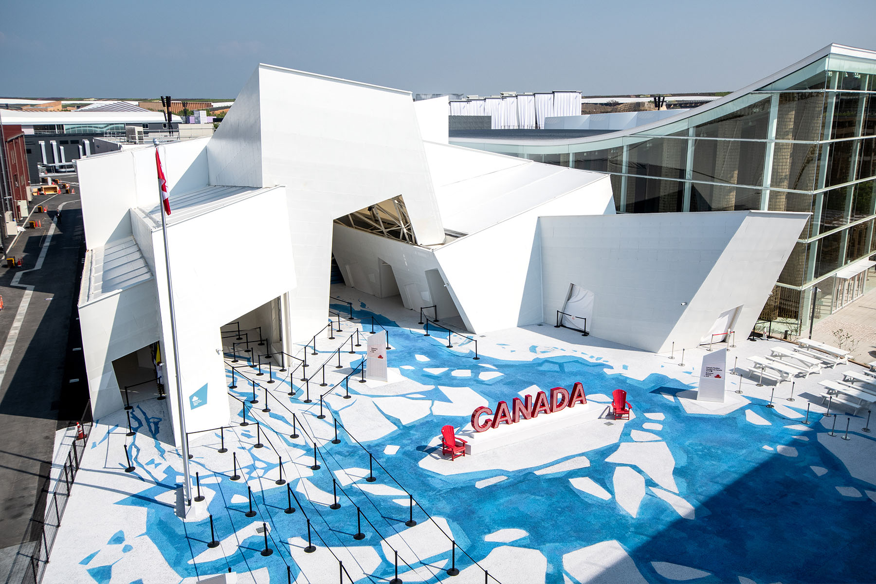 The impressive Canadian pavilion exterior is based on the motif of “frozen waterways,” a natural phenomenon seen in Canada. When the frozen river water thaws and breaks up with the arrival of spring, flowing ice jams catch the eye of visitors.