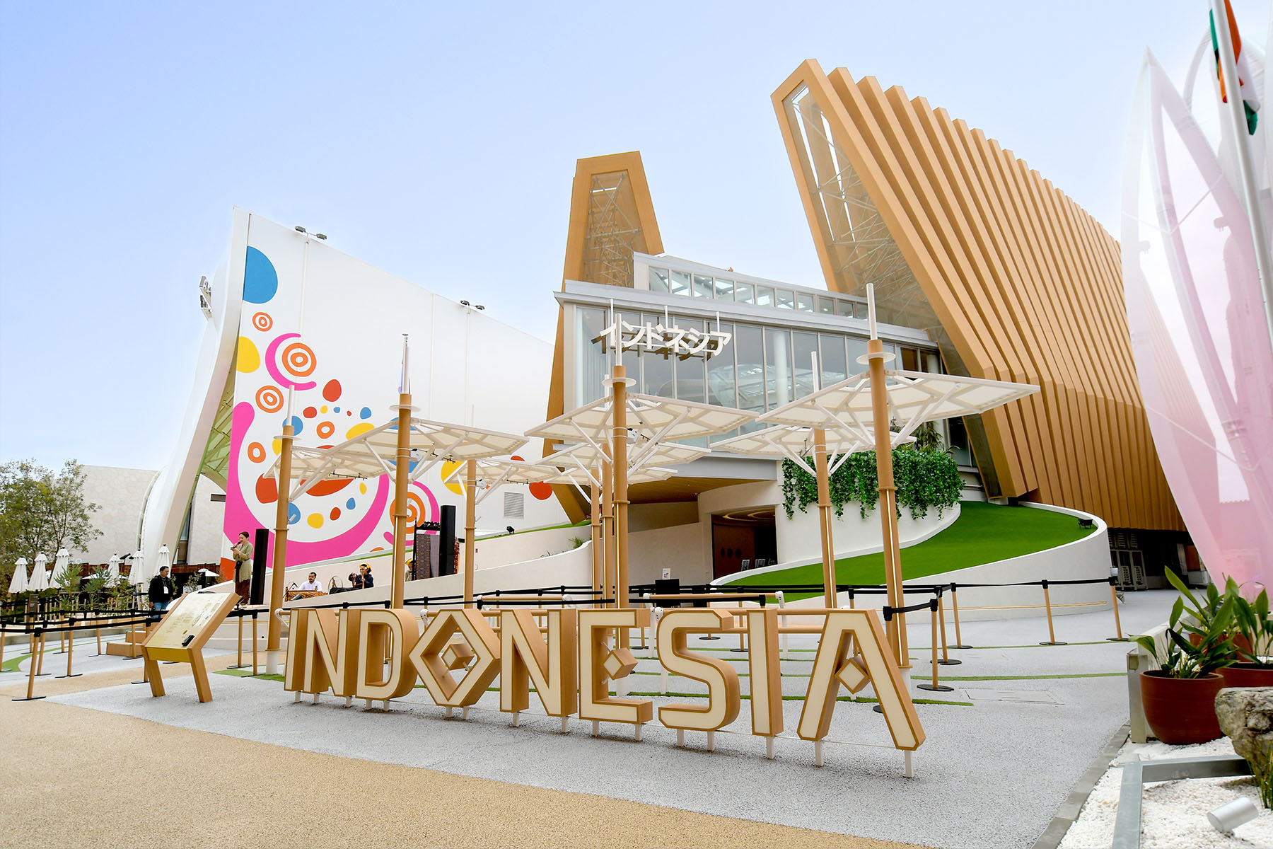 The pavilion features a “Nature Area” modeled after a jungle lushly filled with tropical plants; a “Culture Area” where visitors can experience a variety of traditional culture that includes renowned Javanese batik textiles, and Wayang Kulit shadow puppetry; and a “Future Area” introducing the new capital city of Nusantara as well as Indonesia’s efforts toward renewable energy.
